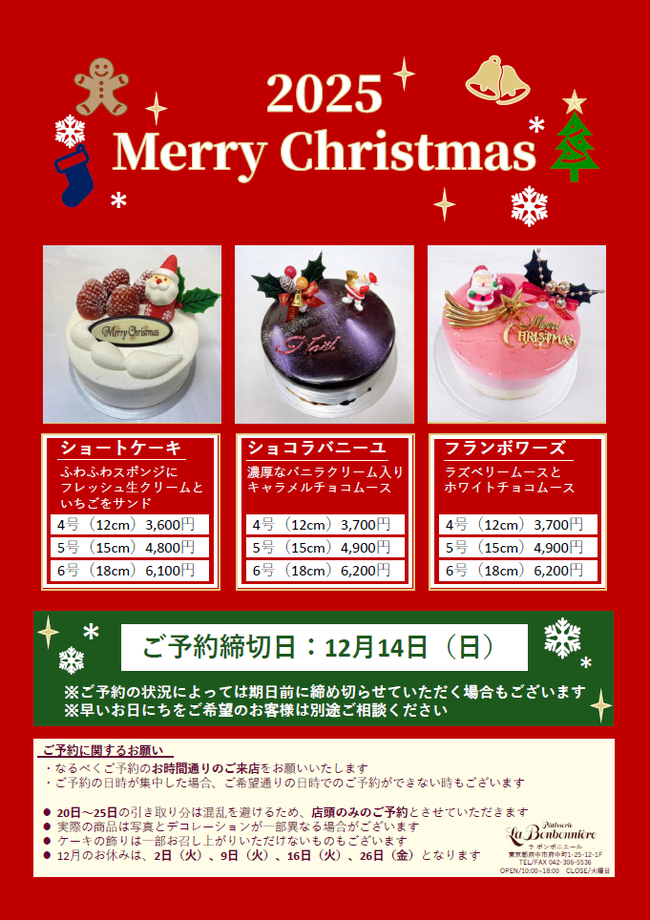 クリスマスケーキのご予約開始しました。締め切りは12月14日で店頭でのみの受付とさせて頂きます。